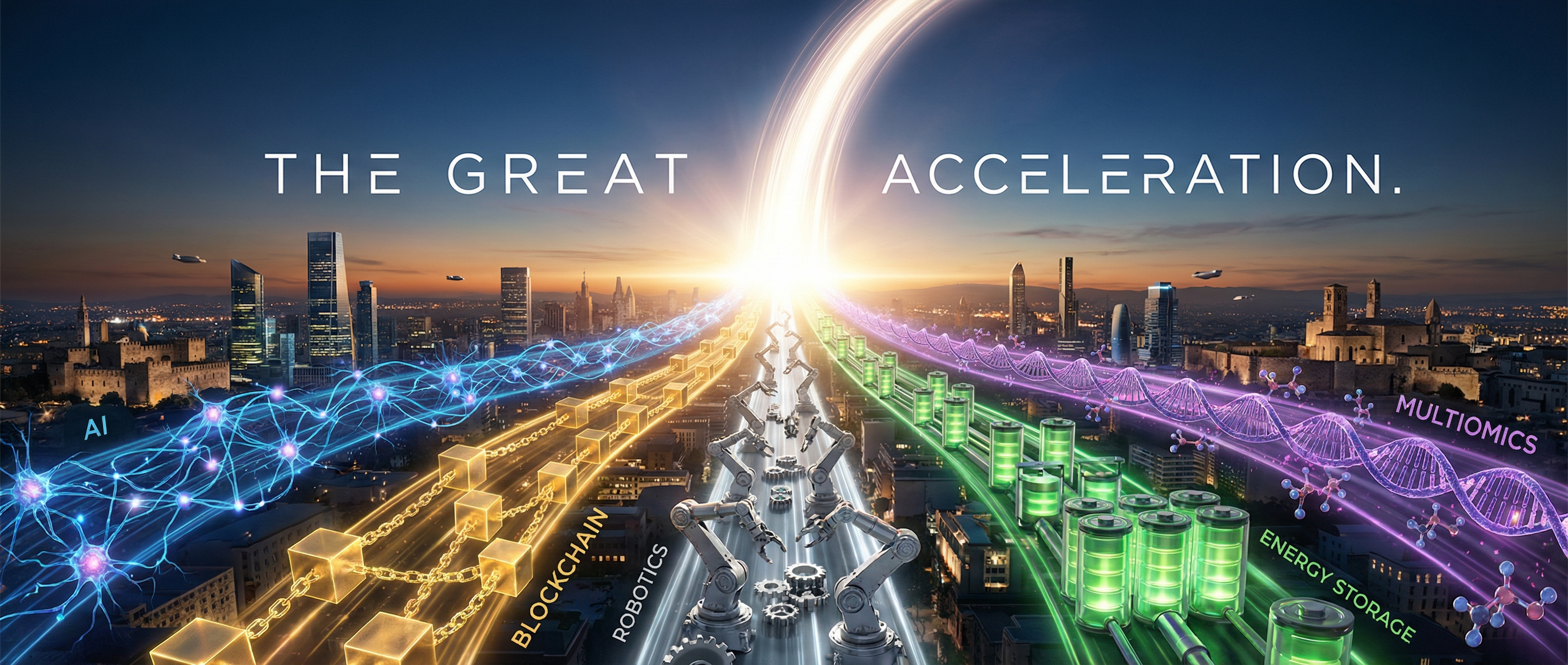 報告認為,人類正處於一個前所未有的歷史節點:五大曾經獨立發展的技術平台——AI、Public Blockchains、Robotics、Energy Storage、Multiomics——正在相互交會、彼此加速,形成一股巨大的複合力量。